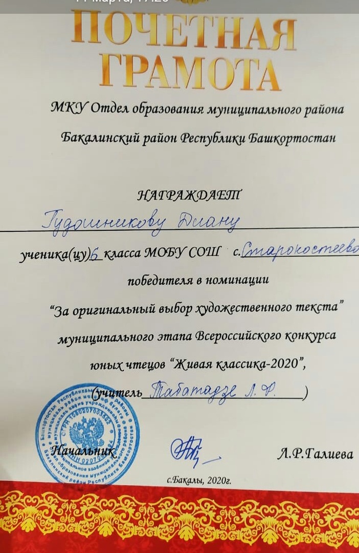 11 марта прошел муниципальный этап Всероссийского конкурса юных чтецов " Живая классика". Ученица нашей школы Г. Диана стала победителем в номинации "за оригинальный выбор художественного текста"! Поздравляем Динау и руководителя Л.Ф.Табатадзе. Желаем им дальнейших успехов!